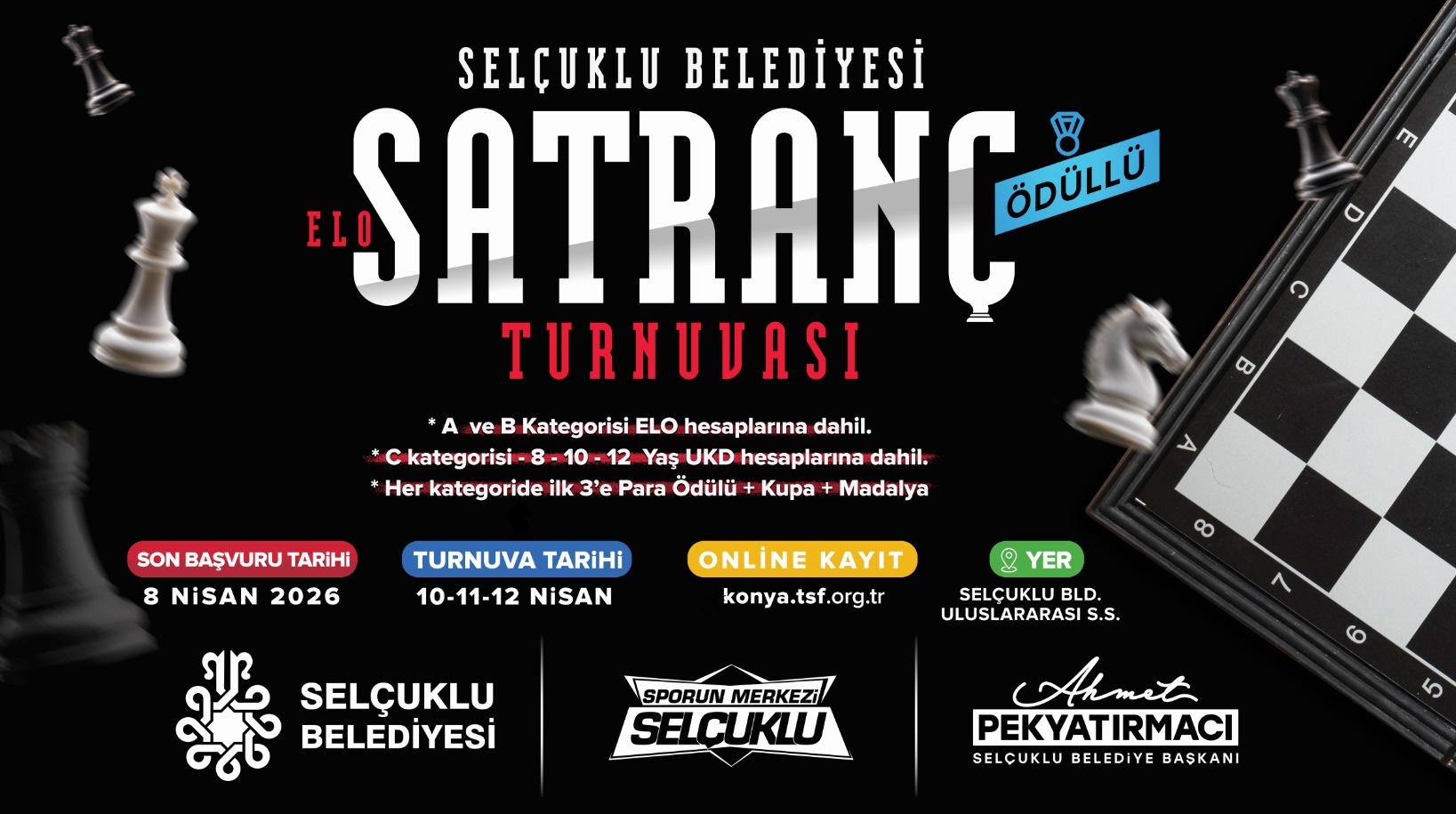 Selçuklu Belediyesi tarafından düzenlenecek olan Satranç Turnuvası, 10-12 Nisan tarihleri arasında Selçuklu Belediyesi Uluslararası Spor Salonu’nda gerçekleştirilecek. Selçuklu Belediyesi tarafından her yıl düzenlenen ve geleneksel hale gelen “Ödüllü Satranç Turnuvası”, 10, 11 ve 12 Nisan tarihlerinde Selçuklu Belediyesi Uluslararası Spor Salonu’nda düzenlenecek. Türkiye Satranç Federasyonu lisansına sahip tüm sporcuların katılım…